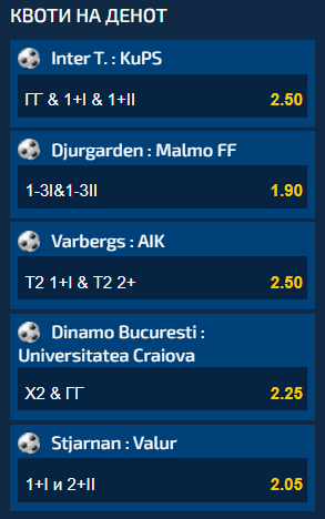 АИК гостува кај Варбергс и е голем фаворит. Комбинацијата за АИК да постигне барем еден гол во првото полувреме, а на крајот да има 2+ погодоци носи коефициент од 2.50.