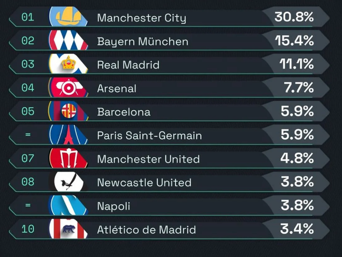 По Сити, следуваат Баерн Минхен со 15,4 отсто, Реал Мадрид со 11,1 отсто, Арсенал 7,7 отсто, Барселона и ПСЖ со по 5,9 отсто. Во Топ 10 како главни фаворити за освојување на трофејот во ЛШ се и ПСЖ, Манчестер јунајтед, Њукасл јунајтед, Наполи и Атлетико Мадрид.