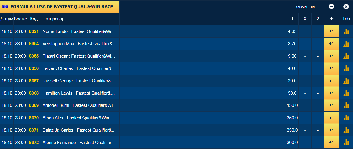 Во Sport Life има опции за да се обложите кој ќе победи на спринт трката, каде Ферстапен е апсолутен фаворит, а како единствени конкуренти се сметаат дека ќе му бидат Ландо Норис и Оскар Пјастри.