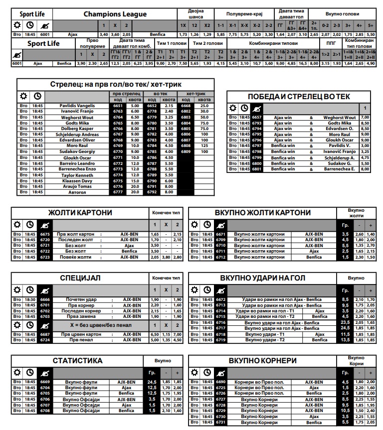 Според коефициентите, сепак, Бенфика е фаворит на ова гостување. Можете да одиграте уште „милион други игри“ во Специјалот што е подготвен во Sport Life. Покрај победа и стрелец во тек на натпревар или стрелец на прв гол, можете да одиграте и на жолти картони, корнери, офсајди, фаули, удари во рамки на гол…