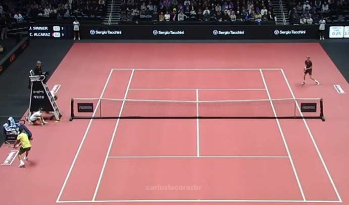 Jannik Sinner and Carlos Alcaraz trying to hit the most extreme angles possible during their exhibition in Seoul