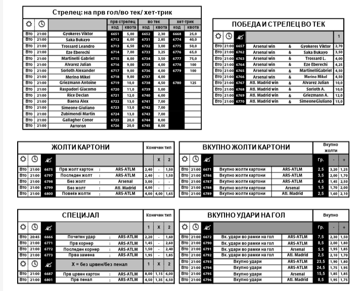 Може да типувате на стрелци (прв стрелец на средбата, стрелец било кога во текот на мечот, дали некој ќе постигне хет-трик), комбинација на победниик со стрелец. Ако верувате дека Атлетико ќе победи, а гол ќе постигне Алварес, Сорлот, Гризман или Џулијано Симеоне, треба да уплатите во Sport Life бидејќи квотите за оваа комбинација се од 10.0 нагоре.
