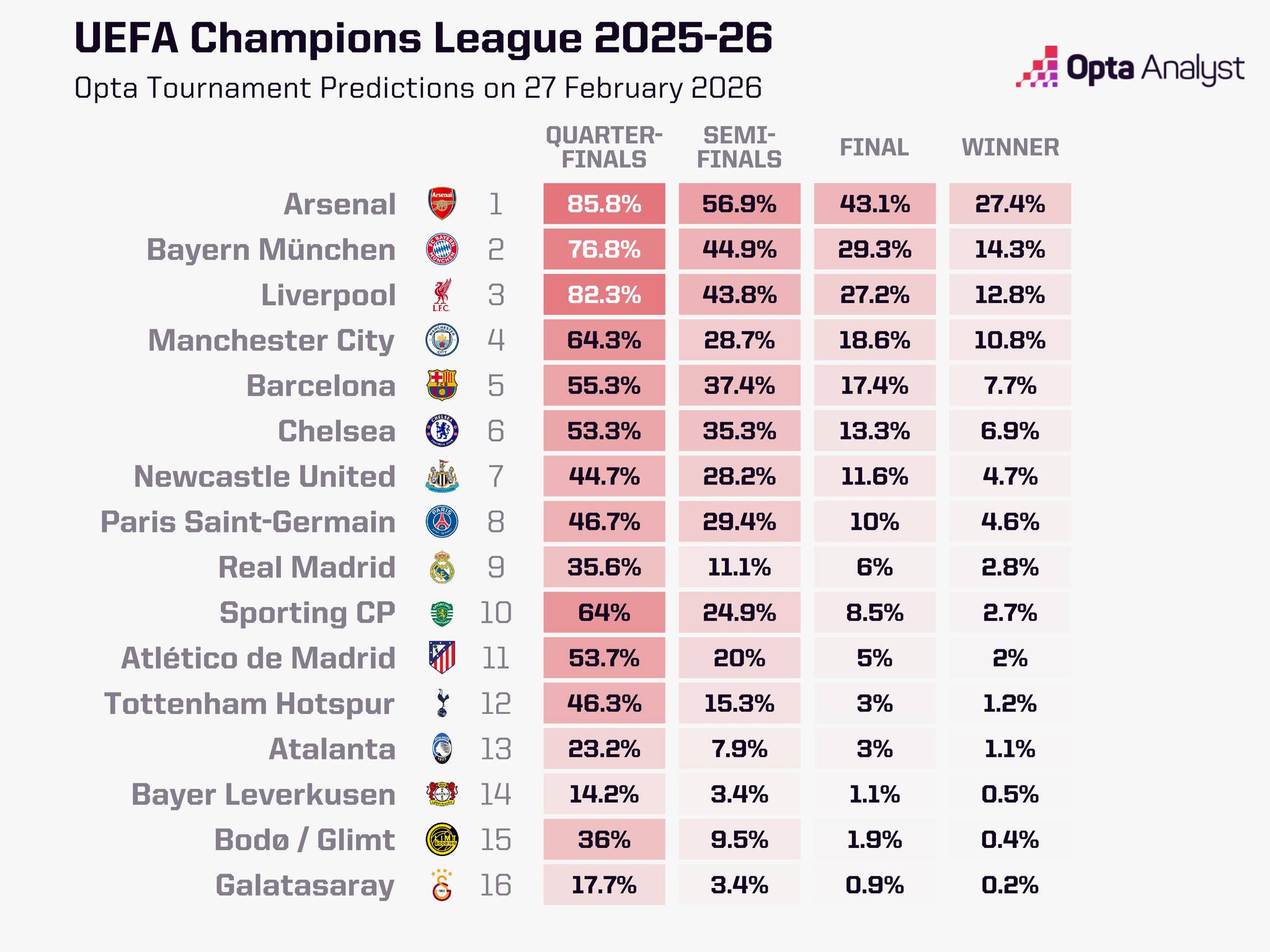 Барселона има 7,7 отсто шанси да биде шампион, додека големиот сребрен трофеј да го кренат фудбалерите на Ливерпул е со 12,8 отсто. Германскиот гигант Баерн Минхем е втор, веднаш зад Арсенал со 14,3 отсто шанси да биде првак во ЛШ.
