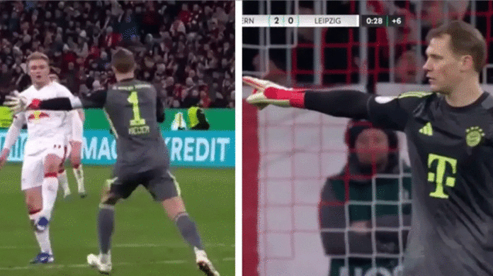 Легендарниот голман Мануел Нојер сакаше да дегажира, но неговиот шут беше изблокиран од младиот Данец, Конрад Хардер, кој стоеше недозволено преблиску. Топката се одби настрана, а тогаш ветеранот и очигледно голем авторитет, Нојер, му нареди на 20-годишниот играч на Лајпциг да оди по топката.