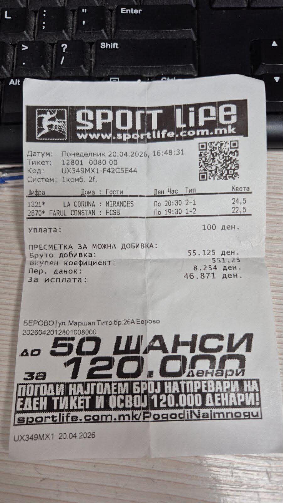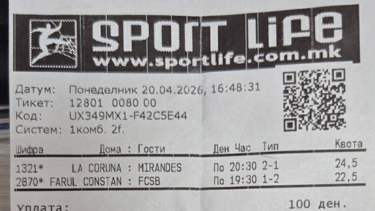 Во објект на Sport Life во Берово вчера бил уплатен тикет на кој точно се типувани два пресвртa во играта „полувреме-крај“ и уплатата од 100 денари на овој обложувач му донесе бруто-добивка од 900 евра.