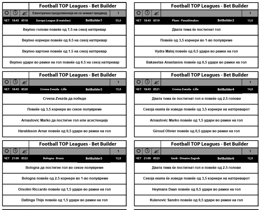 Има осум билдерски комбинации со двоцифрени квоти, од кои најголемата од 55.0 е за Лигата на Европа. За да бидете добитни, потребно е на сите осум натпревари од ЛЕ да има барем два гола и картони, а барем по 7 корнери и удари во рамките на гол. Делува примамливо и не е нереално.