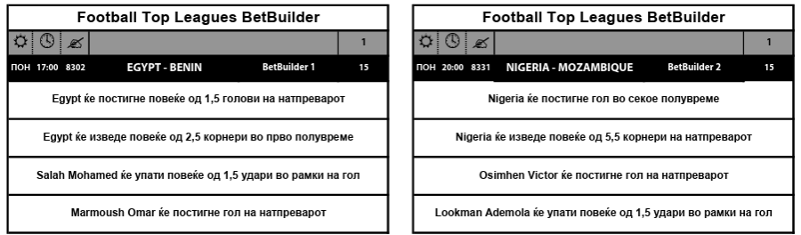 За да бидете добитни, потребно е Египет или Нигерија, зависи кој е вашиот фаворит, а можеби и двата тима, да даваат голови, и да имаат одреден број на корнери, како и директен придонес со гол или асистенција да имаат ѕвездите Салах и Мармуш од Египет, и Осимен и Лукман од Нигерија.