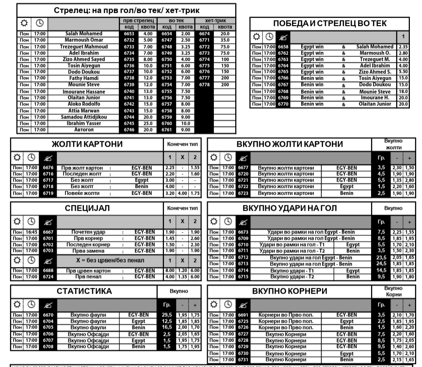 Што се однесува до Специјалот, тој е за дуелот на Египет и Бенин. Фараоните се големи фаворити за победа, затоа и квотите за прв стрелец се најмали кај Салах, Мармуш и Трезеге, а на Бенин му се даваат поголеми шанси да има повеќе картони, да направи пенал, итн.