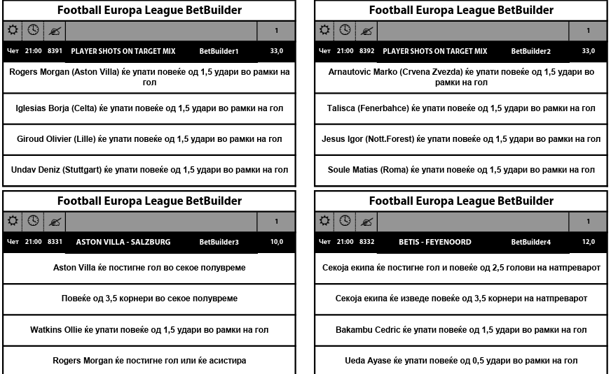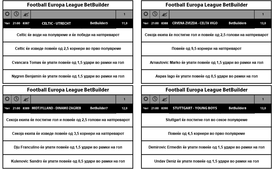 Посебни билдерски комбинации со двоцифрени квоти има и за шест меча кои се играат вечерва во Лига Европа, од кои на три се фаворизираат Астон Вила, Селтик и Штутгарт, а тука се и балканските гиганти Црвена ѕвезда и загрепски Динамо.