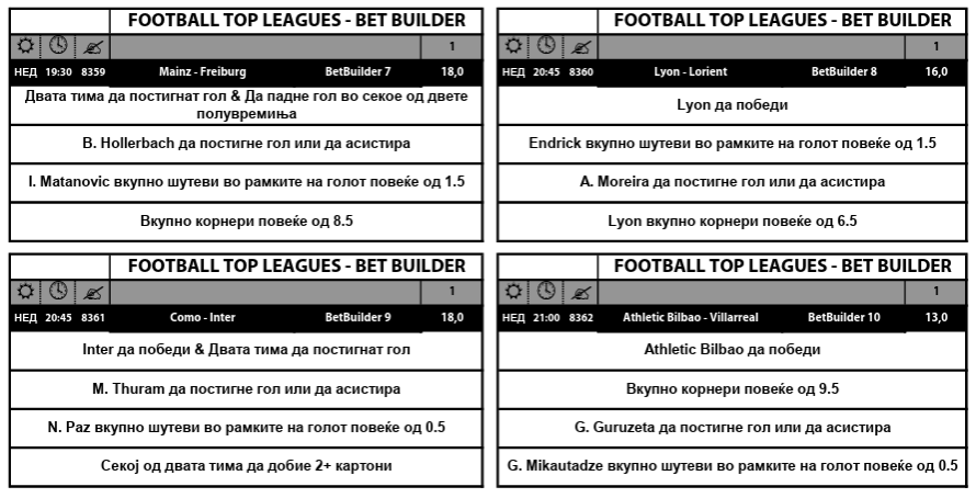 За добивка, потребно е да се исполнат четири услови. Тука се и двата дневни микса за шпанската и италијанската лига кои носат квоти од по 120.0. И во Ла Лига и Серија А денеска се играат по четири меча, па потребно е на сите овие четири меча да се исполнат услови во вид на голови, картони, шутеви и корнери.