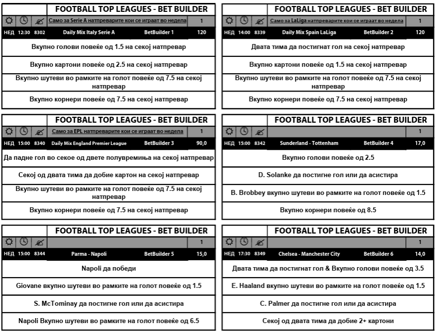За добивка, потребно е да се исполнат четири услови. Тука се и двата дневни микса за шпанската и италијанската лига кои носат квоти од по 120.0. И во Ла Лига и Серија А денеска се играат по четири меча, па потребно е на сите овие четири меча да се исполнат услови во вид на голови, картони, шутеви и корнери.