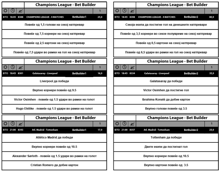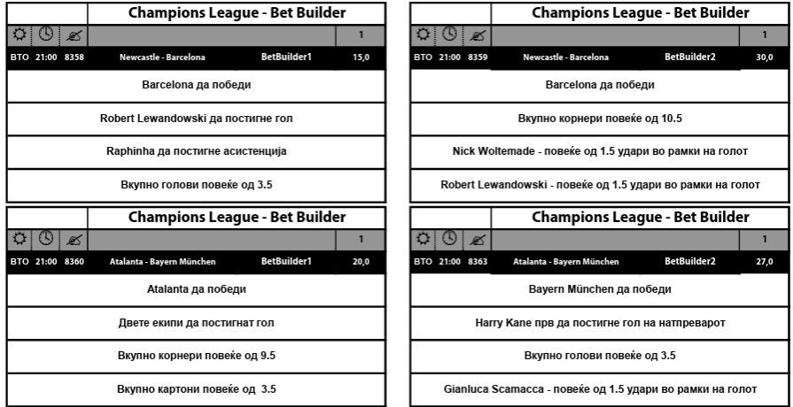 Има по два билдери за секој од четирите меча, а само кај Њукасл нема опција да победи против Барселона, сите други екипи се фаворизирани барем со по еден билдер.