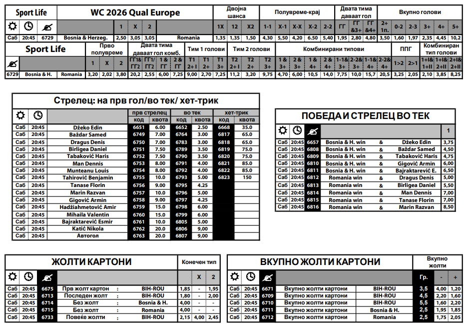 Босна и Херцеговина на свој терен во Зеница игра против Романија во меч кој може многу да значи во квалификациската група за пласман на СП 2026. БиХ е на второто место со 13 бодови, а Романија е трета со 10. Тоа значи дека ако БиХ победи, сигурно ќе има обезбедено место во баражот, но ќе остане и со шанса за директен пласман на Мундијалот.