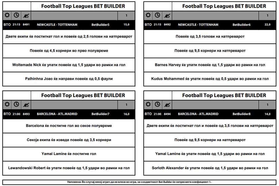 На дербито на „Камп ноу“ меѓу Барселона и Атлетико Мадрид може да се дојде до квота од 16, а потребно е Барселона да даде гол во двете полувремиња, секоја екипа да изведе над 3,5 корнери, Ламин Јамал да даде гол и Левандовски да има над 1,5 шута во рамките на голот.