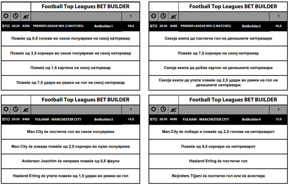 На дуелот меѓу Фулам и Манчестер сити се нуди квота од 15, а потребно е: Манчестер сити да победи и да има повеќе од 2,5 голови на меч, да има повеќе од 9,5 корнери на меч, Ерлинг Халанд да даде гол, Рејнал Тијани да даде гол или да има асистенција.