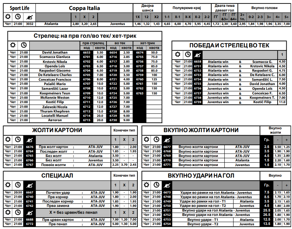 Дуел за пласман во полуфиналето во Купот на Италија, а традицијата покажува дека може да се очекува многу неизвесна пресметка. Во последните 10 средби на овие два тима, Јувентус има две победи, Аталанта се радувала двапати, а дури шестпати било нерешено. Сега мора да има победник, па макар тоа било и по изведување пенали.