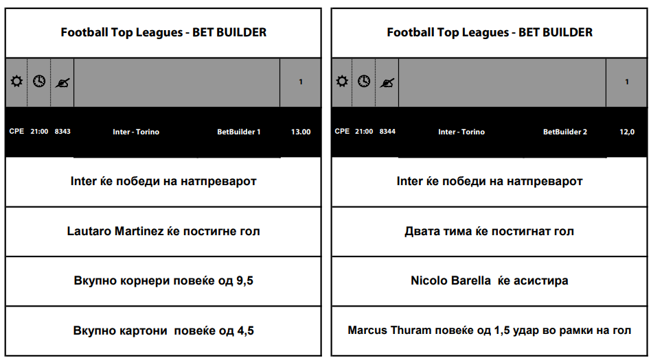 Интер е домаќин на Торино во Купот на Италија, а една од комбинациите која носи квота од 13 е: Интер да победи, Лаутаро Мартинес да постигне гол, вкупно да има над 9,5 корнери и вкупно да има над 4,5 картони.