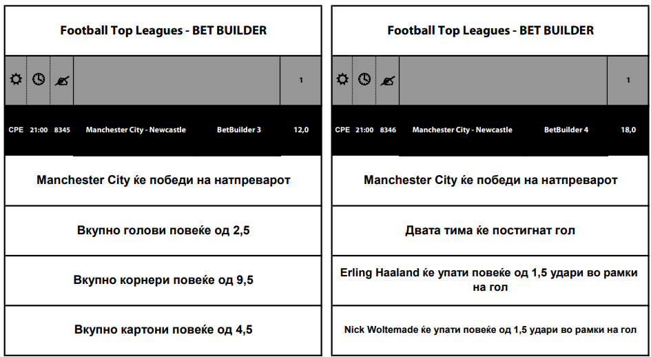 Една од понудените комбинации во Бет билдерот нуди квота од 18, а потребно е: Сити да победи, двата тима да постигнат гол, Ерлинг Халанд да има над 1,5 шутеви во рамките на голот и Ник Волтмејд да има над 1,5 шутеви во рамките на голот.