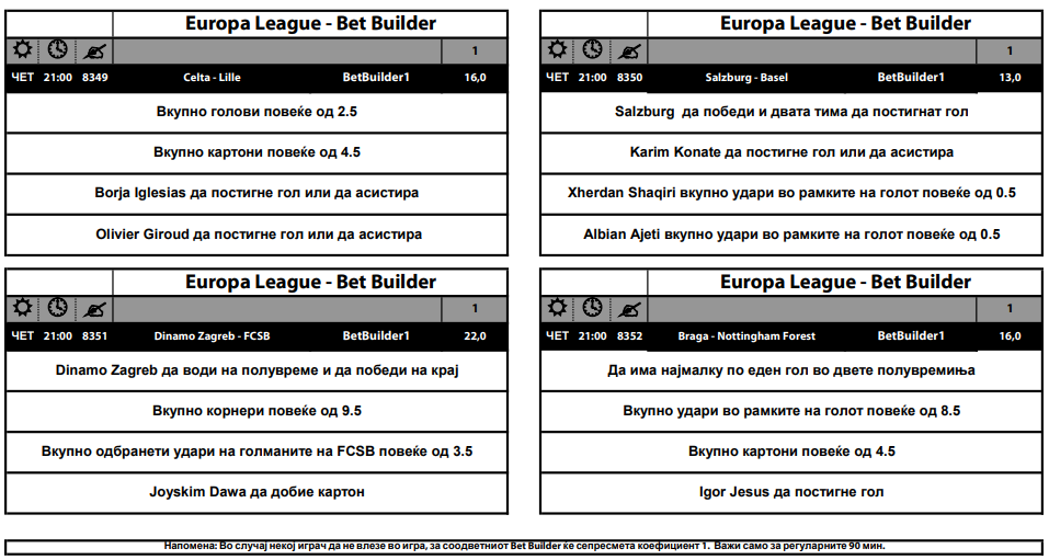 Дури десет средби што ќе се играат вечерва во Лигата на Европа се дел од Бет билдер понудата, во која квотите се одлични и се движат од 13 до 22. За дуелот меѓу Динамо Загреб и ФЦСБ има квота од 22, која ќе биде добитна ако: Динамо води на полувреме и победи на крај, вкупно има над 9,5 корнери, вкупно одбрани на голманите на ФЦСБ над 3,5 и Јоским Дава да добие картон.