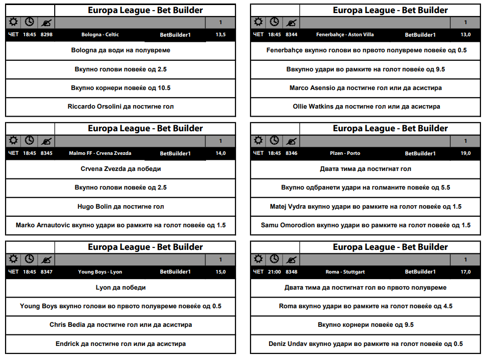 Дури десет средби што ќе се играат вечерва во Лигата на Европа се дел од Бет билдер понудата, во која квотите се одлични и се движат од 13 до 22. За дуелот меѓу Динамо Загреб и ФЦСБ има квота од 22, која ќе биде добитна ако: Динамо води на полувреме и победи на крај, вкупно има над 9,5 корнери, вкупно одбрани на голманите на ФЦСБ над 3,5 и Јоским Дава да добие картон.