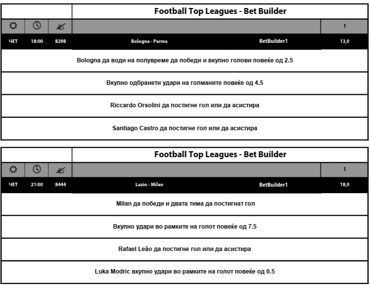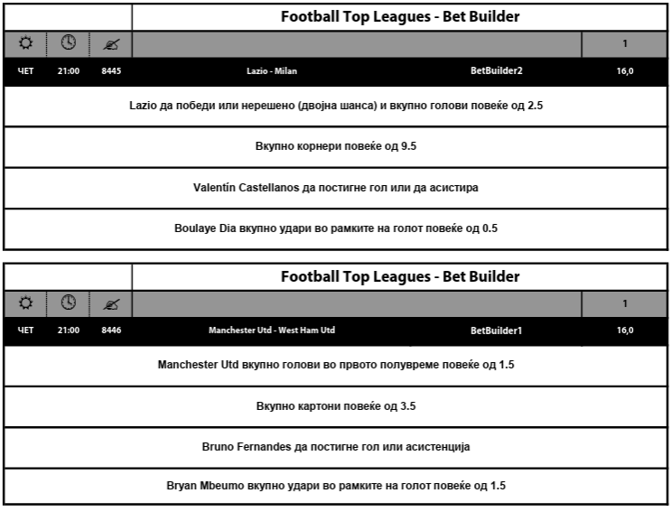 Има два билдери за Лацио – Милан, по еден кој ги фаворизира двата тима, а по еден за Болоња – Парма и Манчестер јунајтед – Вест хем.