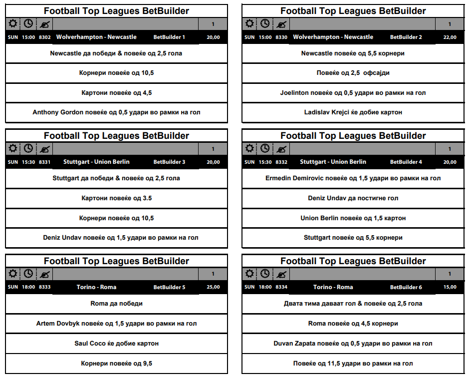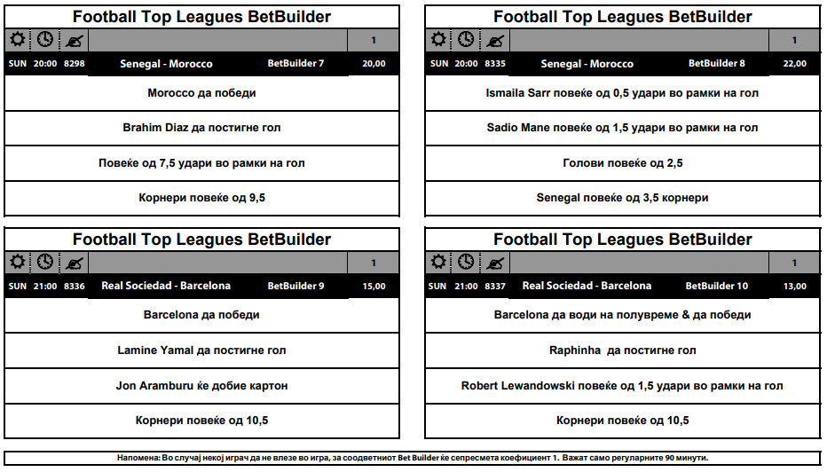 Пет екстра возбудливи дуели се дел и од понудата на Бет билдер каде има 10 понудени опции а коефициентите се одлични на сите и се движат од 13 до 25. Реал Сосиедад ја пречекува Барселона, а 15 коефициент ќе биде добитен ако: Барселона победи, Јамал даде гол, Арамбуру добие картон и бидат изведени повеќе од 10,5 корнери.