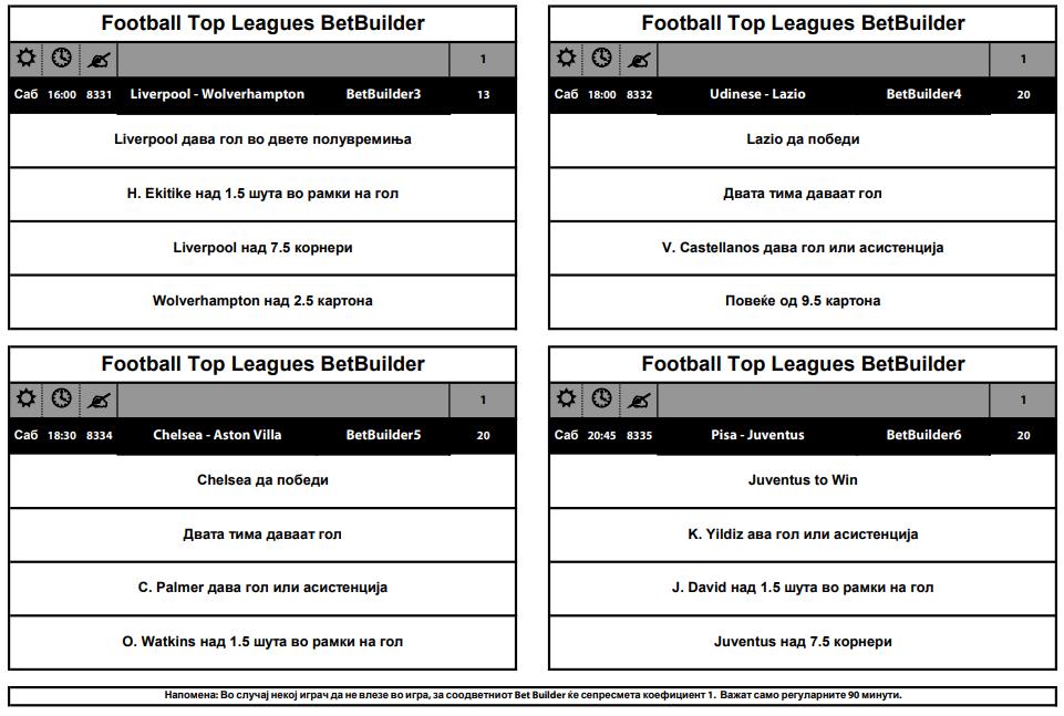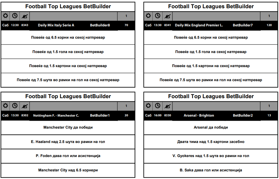 Да биде добитна комбинацијата која носи квота од 120 потребно е: на сите мечеви во Премиер лигата да има над 6,5 корнери, на сите мечеви во Премиер лигата да има над 1,5 голови, на сите мечеви во Премиер лигата да има над 1,5 картони, на сите мечеви во Премиер лигата да има над 7,5 шутеви во рамките на голот.