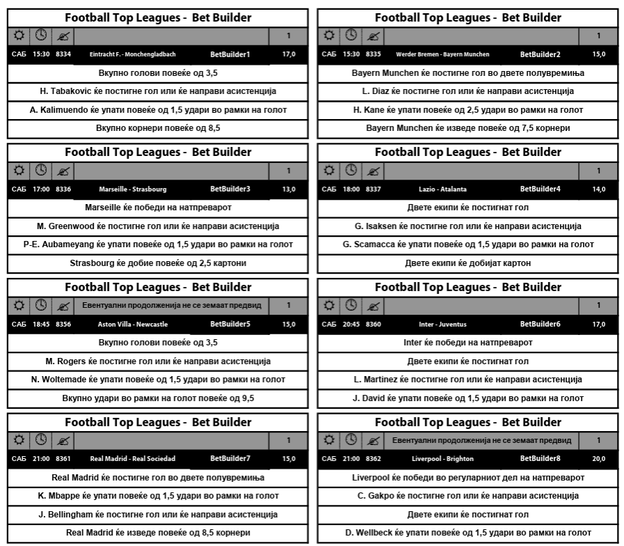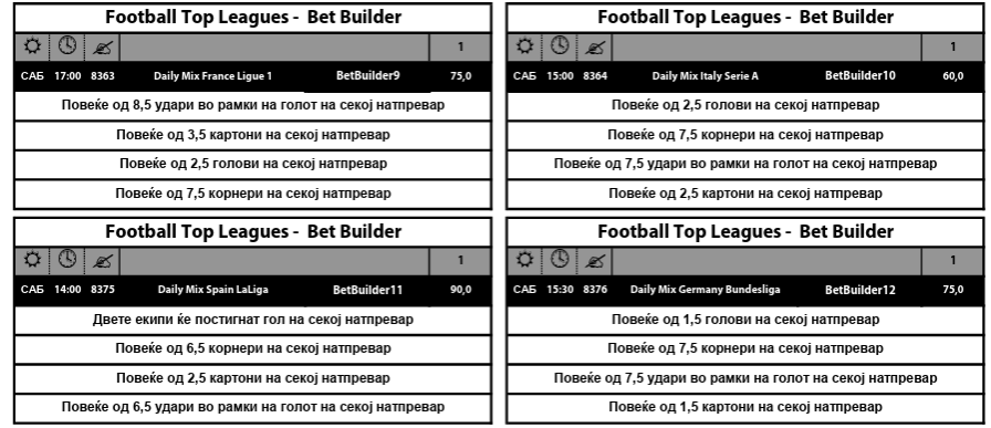 Sport Life за денеска подготви 12 Бет билдер комбинации, сите со двоцифрени квоти, без разлика дали се миксови од лигите или за поединечни натпревари од топ 5 првенствата.