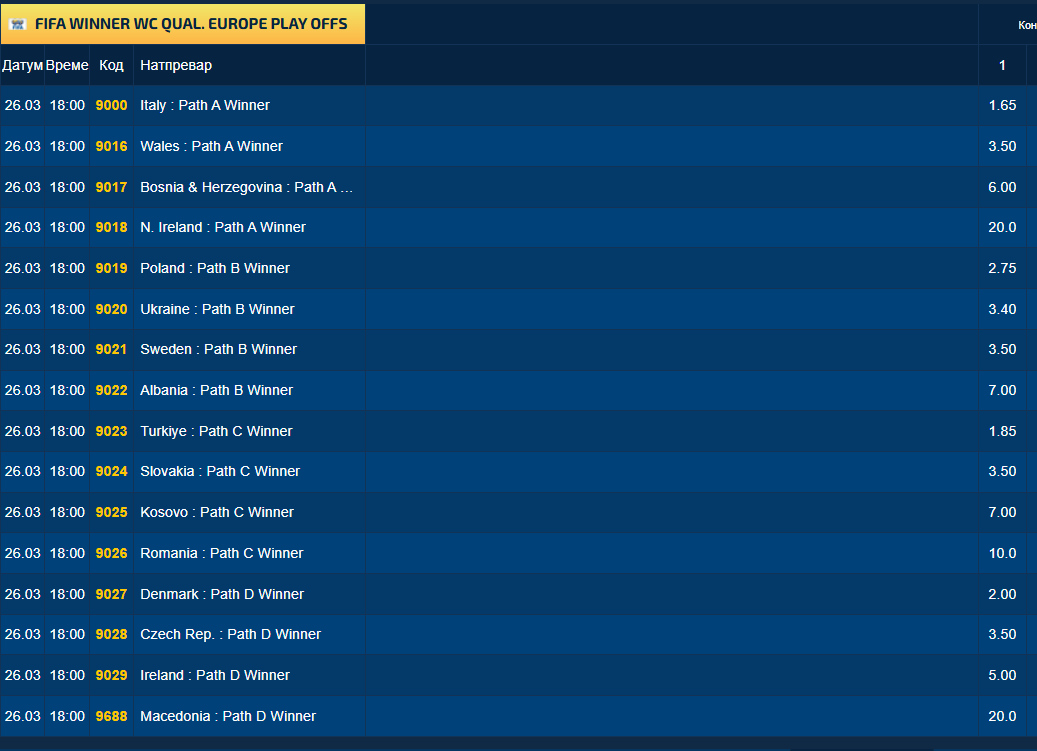 Од оваа четворка, фаворит за пласман на Мундијалот е Данска, додека квотата за Македонија е дури 20.0, исто како и кај Северна Ирска, која има бараж со Италија, па Велс или БиХ. Ако сте патриотски и оптимистички настроени, оваа квота не смее да се пропушти, би добиле бруто-добивка 20 пати поголема од уплатата ако Македонија оди на СП 2026.