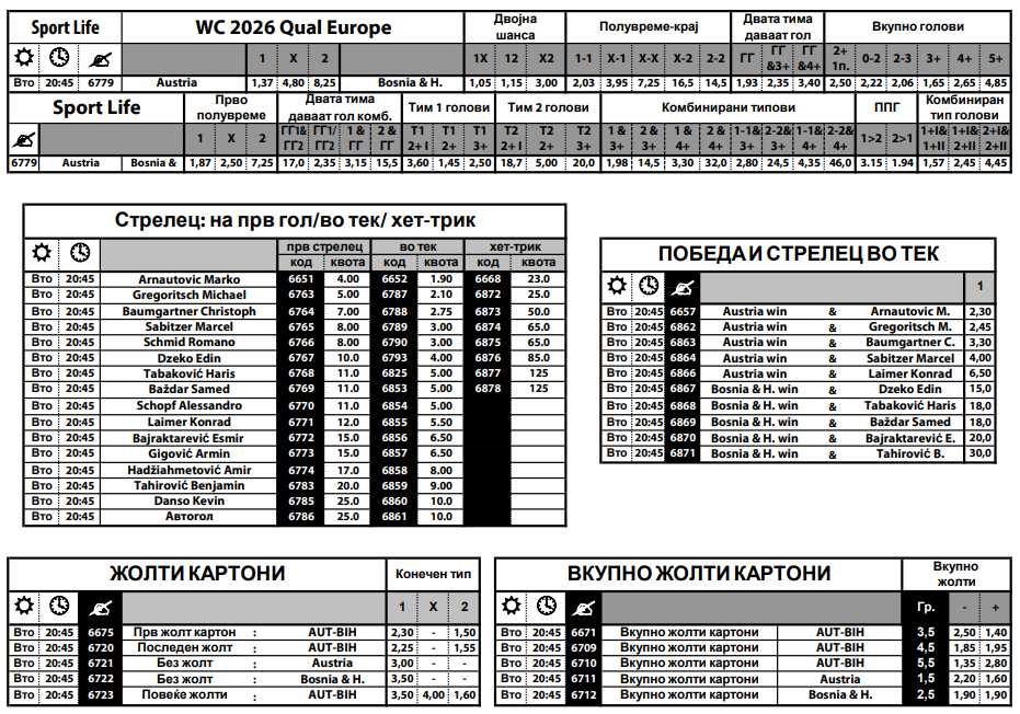 Супер интересна е и комбинацијата БиХ да победи, а Џеко да постигне гол и тоа се вреднува со 15 коефициент. За разлика од оваа комбинација, една од најреалните е Австрија да победи, а Марко Арнаутовиќ да постигне гол е со квота од 2.30.