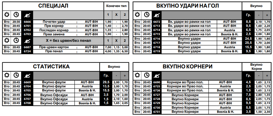 Тука се и понудите за мераклиите на статистиките, па има суперинтересни комбинации за тоа колку жолти каротни ќе бидат доделени, колку вкупно удари има во рамките на голот, но и кон голот, како и бројот на изведени корнери, направени фаули и колку пати ќе биде подигнато знаменцето за офсајд.