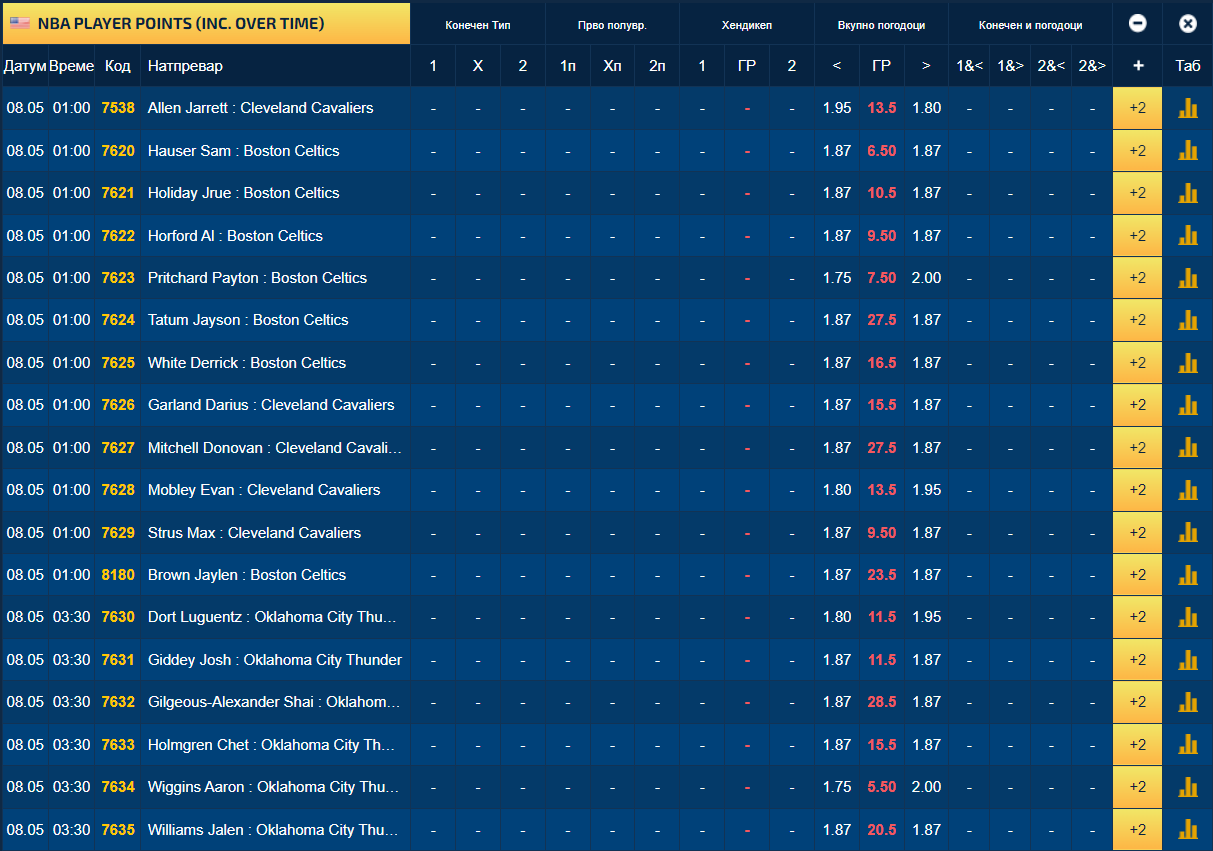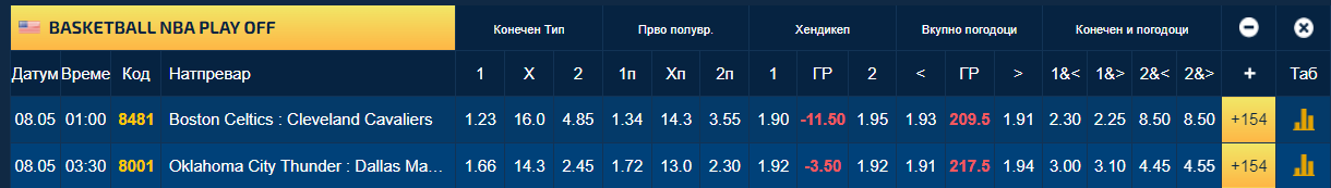 Вечерва по полноќ започнуваат две полуфинални конференциски пресметки во НБА плејофот. Бостон кој имаше најдобар скор по регуларниот дел од сезоната е голем фаворит во дуелот против Кливленд. Сепак, интересно е дека Кливленд има четири победи во последните седум пресметки, а дури три триумфи Кливленд ги имал дури по продолжение, што значи дека ако се следи традицијата можно е да има и „икс“, кој се вреднува со голем коефицинет од 16.