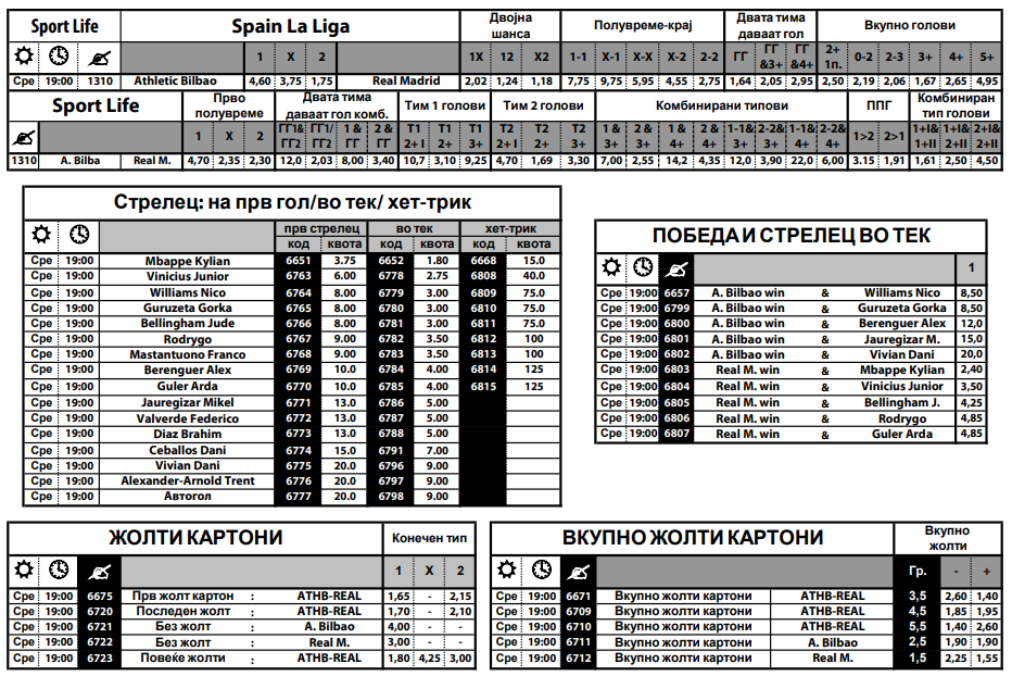 Специјални понуди во Sport Life вечерва има за два меча. Првиот е дербито во Шпанија меѓу Атлетик Билабо и Реал Мадрид. Кралскиот клуб има три нерешени средби по ред и сега ќе атакува на победа.