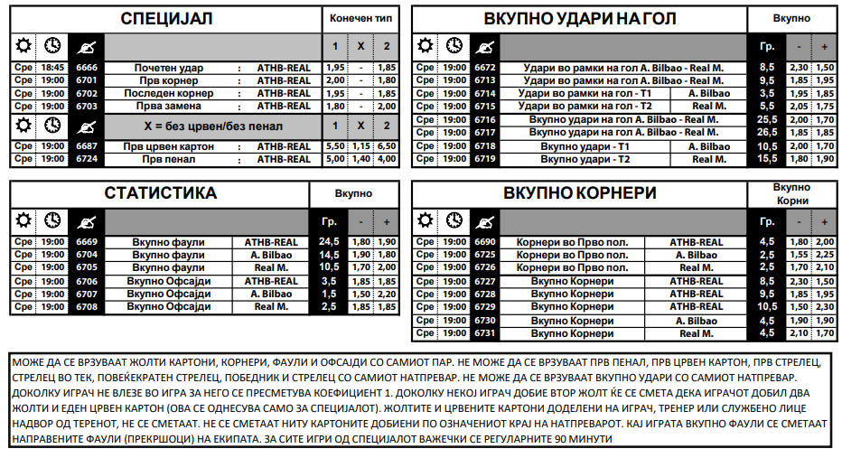 Интересно е и тоа дека главен адут на Кралскиот клуб во тие пет средби со Атлетик бил Родриго, кој бил стрелец на три гола. Бразилецот сега е во очајна форма и постави клупски антирекорд откако 30 меча по ред не постигнал ниту еден гол. Сега да заврши овој пост на Родриго, квотата е 3.50, а тој да биде стрелец на првиот погодок е со квота дури од девет.
