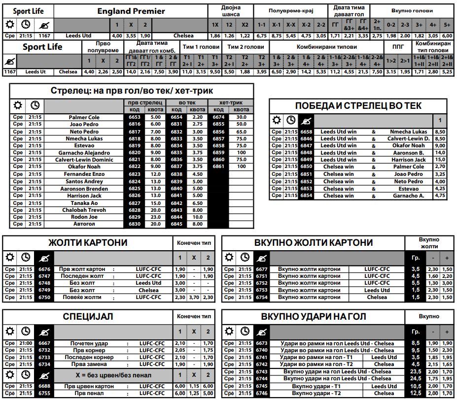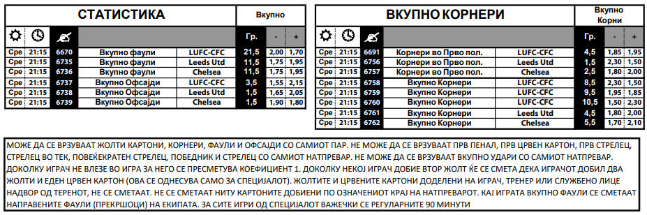 Лидс има четири порази по ред и таа лоша низа ќе се обиде да ја сопре на свој терен против Челзи, кој игра одлично. Традицијата вели дека голови треба да има, а интересно е тоа дека на два од последните четири средби имало исклучување. Сега да има црвен картон е со квота шест, но треба да се погоди и кој тим ќе го заработи.