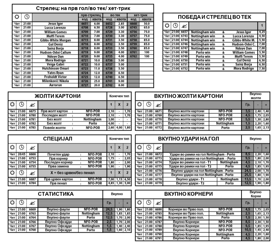 Нотингам форест и Порто вечерва во Англија ќе одлучат кој од нив ќе се најде во полуфииналето на Лигата на Европа откако првиот меч пред една недела на „Драгао“ заврши нерешено 1-1. Победник мора да има, макар и на пенали ако тоа не се случи по 90 или 120 минути игра.