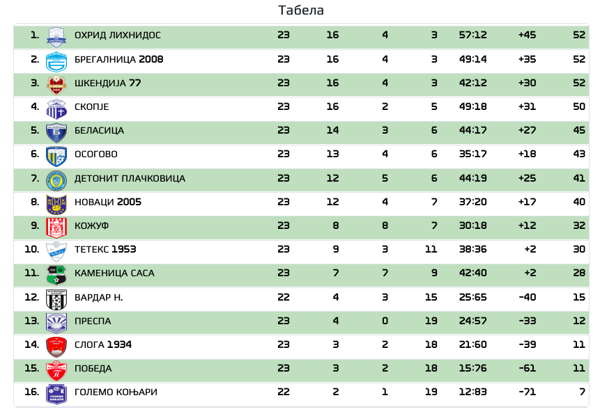Старо-новиот лидер на табелата, Охрид Лихнидос, кој го предводи трилингот од екипи со 52 бода, но со најдобра гол-разлика во моментов, со убедливи 3-0 славеше над Новаци на домашен терен, а Шкендија Арачиново со двата автогола на Мартин Радуловиќ Величковиќ го победи Тетекс.