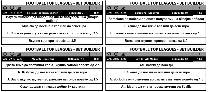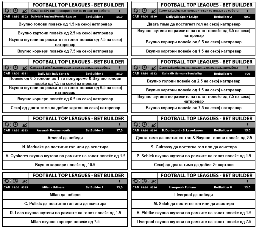 Најмалите квоти се 13.0, а најголема е 100-ката за Бундеслигата. Овој Бет билдер со коефициент 100.0 ќе биде добитен ако на секој од денешните пет меча во германската лига има барем три гола, барем два картони, 8 или повеќе шутеви во рамки на гол и осум или повеќе корнери.