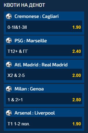 Пет екстра возбудливи дуели се дел од денешната понуда во Квоти на ден, а ако сите пет понудени комбинации ги одиграте на еден тикет, вкупниот коефициент кој ќе го добиете е 43.32.