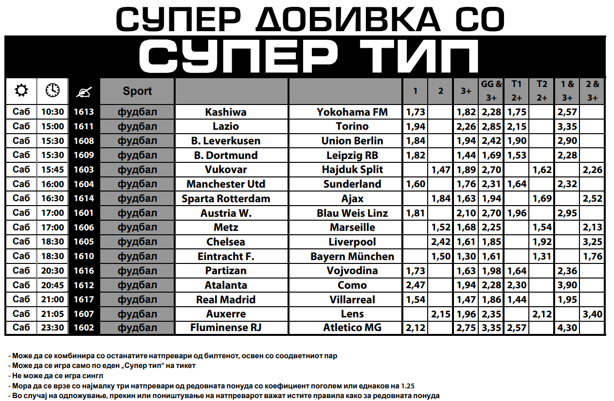 Фудбал и само фудбал е во денешната понуда на Супер тип, каде има зголемени коефициенти на многу атрактивни екипи. Возбудувањата ќе започнат уште претпладне, односно од 10:30 часот кога се игра мечот од јапонското првенство меѓу Кашива и Јокохама, а за победа на домаќинот квотата е 1.73.