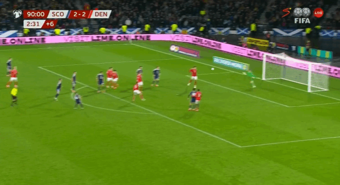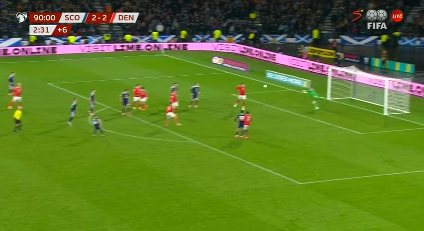 Шкотите водеа со 1:0 и 2:1, но Данска двапати израмнуваше. Беше 2:2 кога во 90+3 минута Киран Тирни постигна одличен гол со кој Шкотска поведе со 3:2 и ги фрли Данците на колена, а домашните навивачи на стадионот во Глазгов беа во делириум. Едноставно Данска беше само на две-три минути од пласман на Мундијалот во 2026 година, но прими гол.