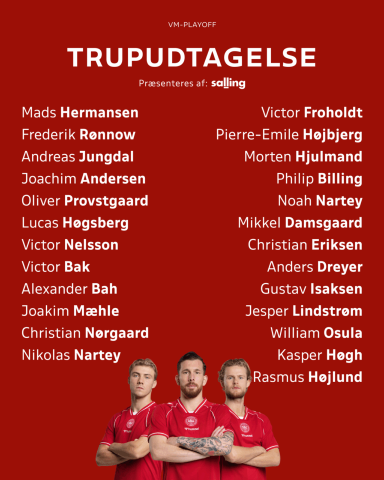 Репрезентацијата на Данска денеска и официјално го објави списокот на репрезентативци за дуелот против Македонија во баражот кој на 26 март ќе се игра во Копенхаген.