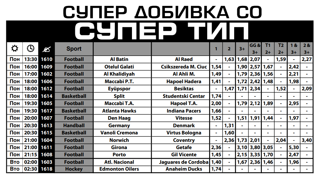 Фудбал, кошарка, ракомет и хокеј има во денешната понуда на Супер типот во Sport Life. Сплит да слави во дуелот со Студентски центар во АБА-лигата е со квота од 1.69. Виртус Болоња е фаворит за победа на гости кај Ваноли, додека во НБА-лигата, Атланта дома да ја победи Индијана е со квота од 1.66.