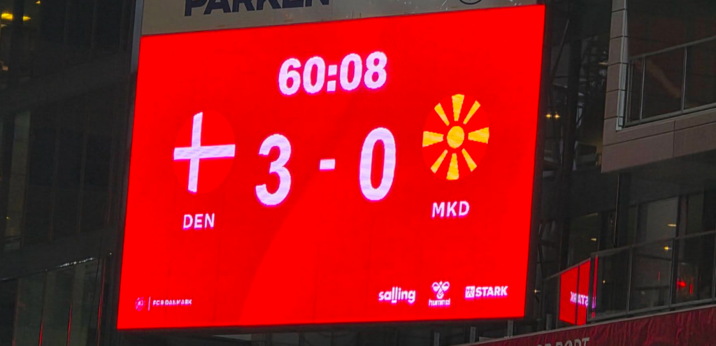 Фудбалската селекција на Македонија претрпе убедлив пораз од Данска (4-0) на стадионот „Паркен“ во Копенхаген, во полуфиналниот бараж за Светското првенство. Клучниот момент на мечот се случи веднаш по паузата, кога домаќинот во само десет минути целосно го реши прашањето на победникот.