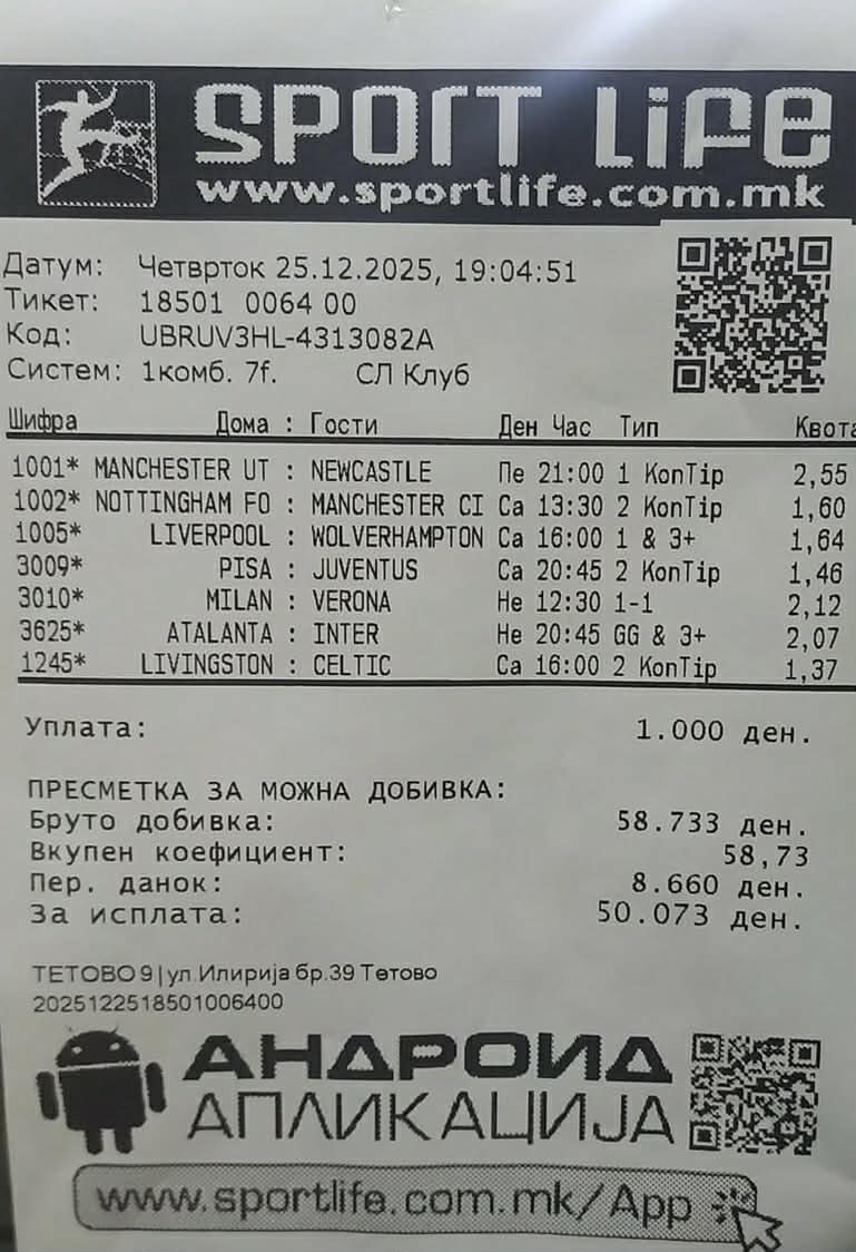 Овојпат можната добивка е одлична и изнесува точно 50.000 денари, останува само да послужи „спортската магија“, па доколку тикетот е добитен, сигурно ќе им донесе огромна радост на оние на кои насмевката во овие моменти им е најпотребна.