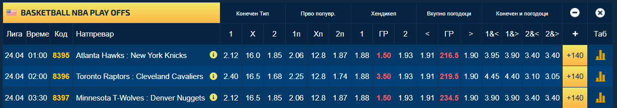 Три меча на кои, интересно, гостите се во фаворитска улога, барем ако се гледаат коефициентите, се дел од ноќната понуда во НБА-плејофот. Минесота направи едно изненадување и го победи Денвер на гости за 1:1 во победи, па сега игра пред своите навивачи. Тоа значи дека Денвер предводен од Никола Јокиќ ќе брка враќање на брејкот, а со тоа и предноста на домашниот терен.