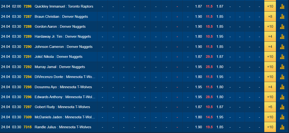 Во понудата за плус-минус поени на играчите има над 30-мина кошаркари. Никола Јокиќ треба да даде 30+ поени за да биде во „плус“, а Мареј е на граница од 25,5 поени.