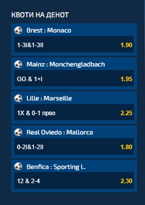 Лил игра против Олимпик Марсеј и ако домаќинот не загуби и во првото полувреме биде постигнат најмногу еден гол, квотата на денот е 2.25.