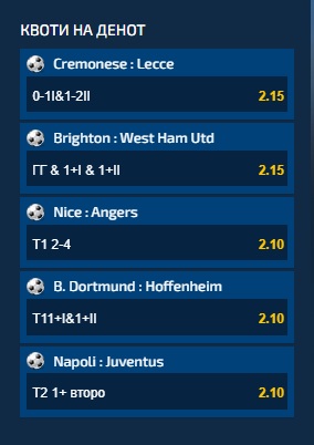 Брајтон игра против Вест хем, и квотата на денот е 2.15 доколку двете екипи постигнат гол, а има и најмалку по еден гол во двете полувремиња.