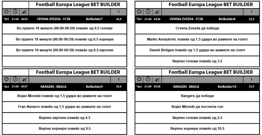 За дуелот во Белград помеѓу единствените некогашни европски прваци од Источна Европа, едниот билдер е само со три услови, се бара во првите 10 минути да има гол, корнер и картон, а квотата е 30.0.